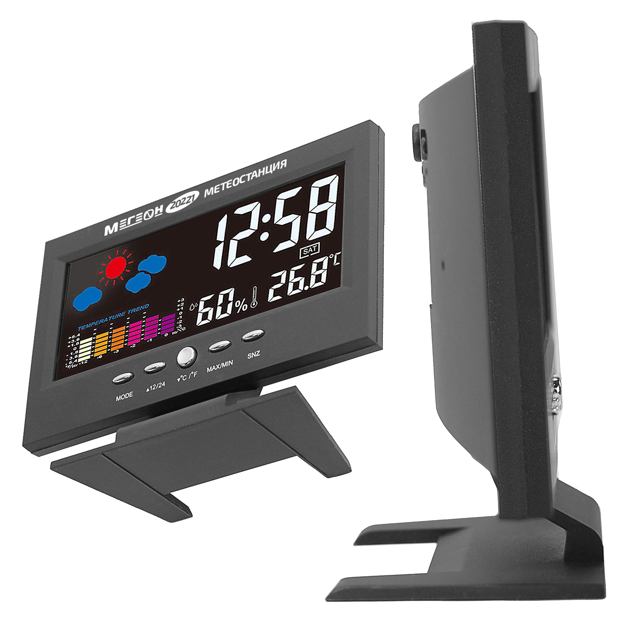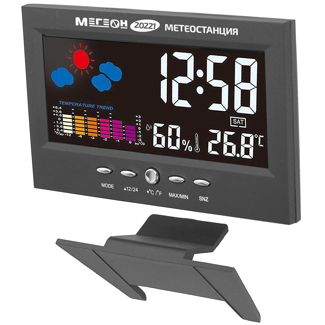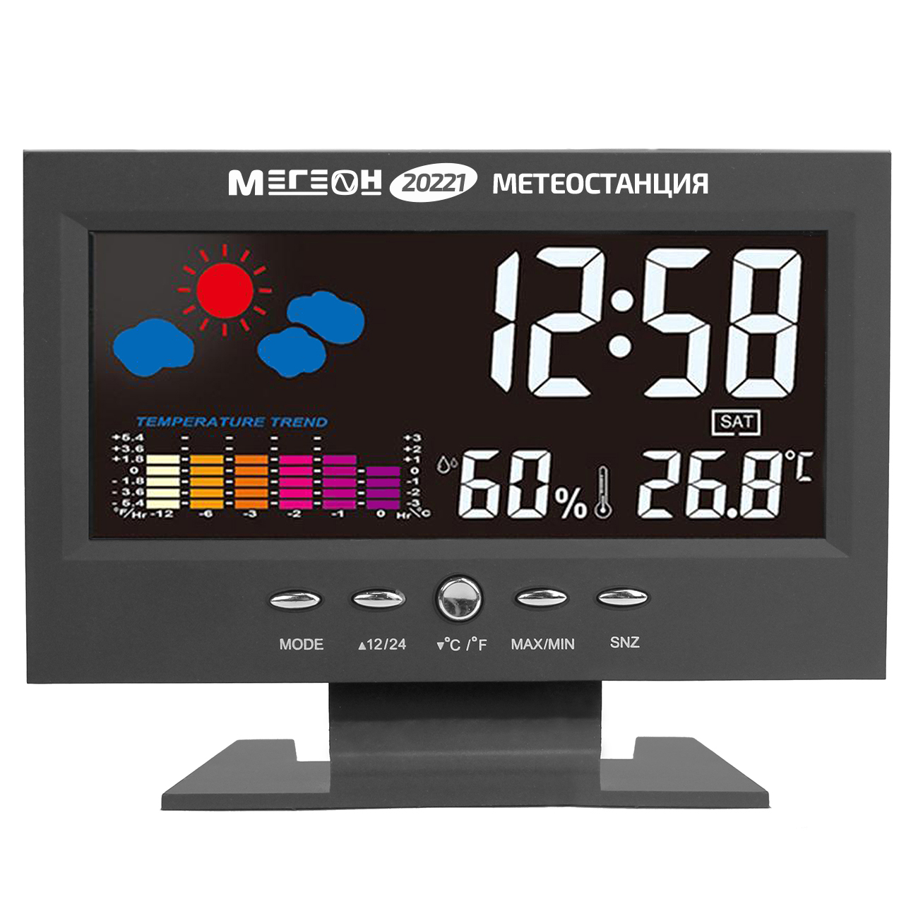 МЕГЕОН 20221 — новинка в модельном ряду термогигрометров для домашнего использования. Модель получила стильный внешний вид и яркий цветной ЖК-дисплей. Прибор одновременно показывает текущее время в 12 или 24 часовом формате, день недели, вычисляет минимальную и максимальную зафиксированные температуру и влажность. Одной из особенностей является наличие функции автоматической активации подсветки экрана при появлении постороннего звука. Метеостанция с успехом заменит будильник, а также предупредит о неблагоприятной обстановке в помещении. Применение современных комплектующих высокого качества позволило добиться низких показателей погрешности и увеличения скорости вычисления данных. Благодаря эргономичному дизайну и компактным размерам изделие идеально впишется в любой интерьер и займёт достойное место на тумбочке в спальне или на письменном столе.