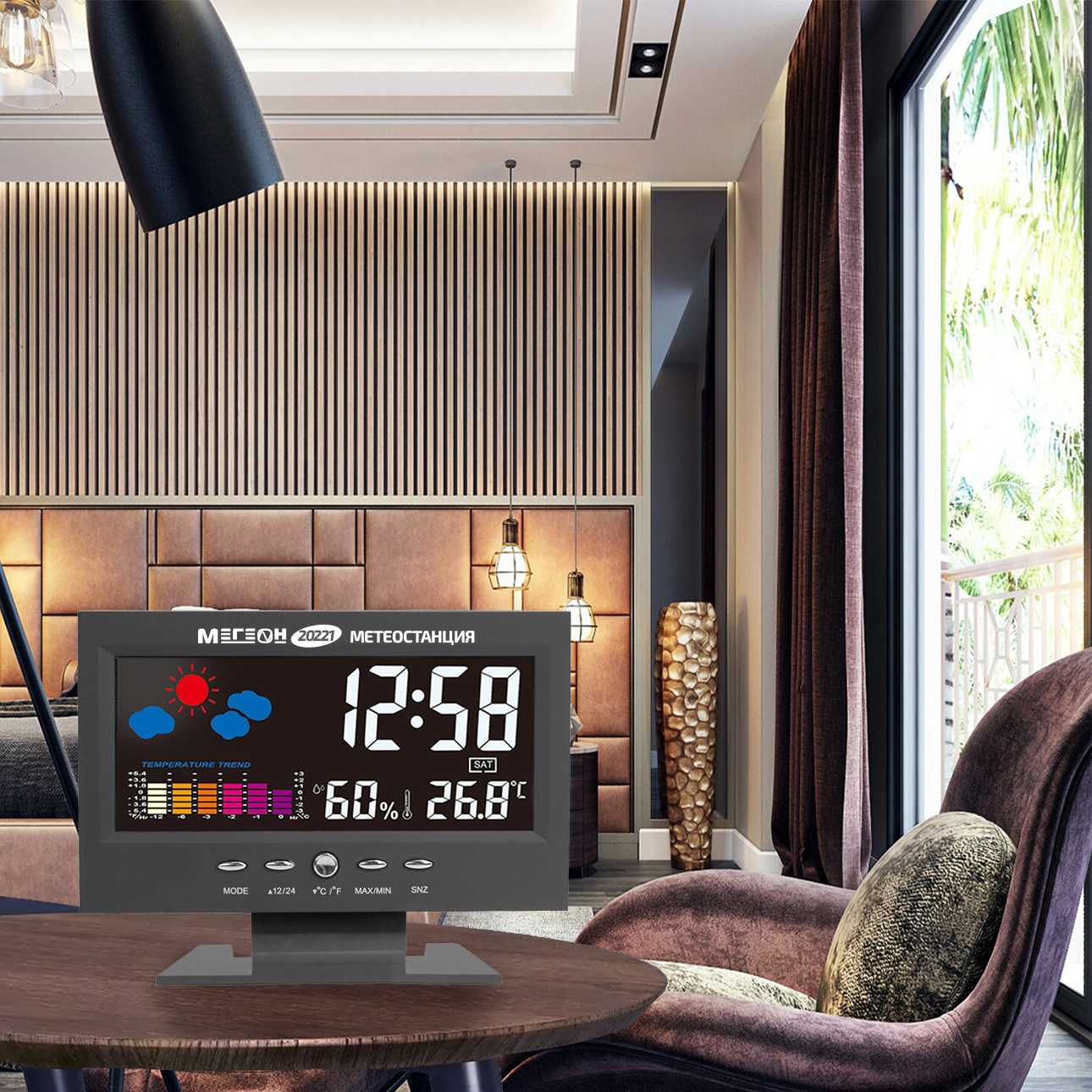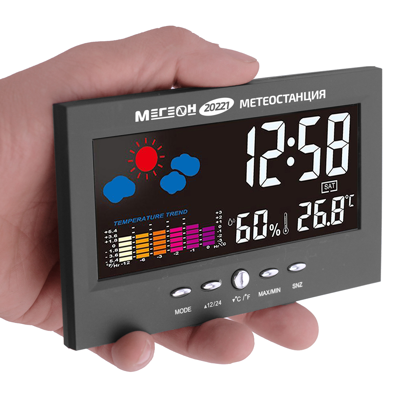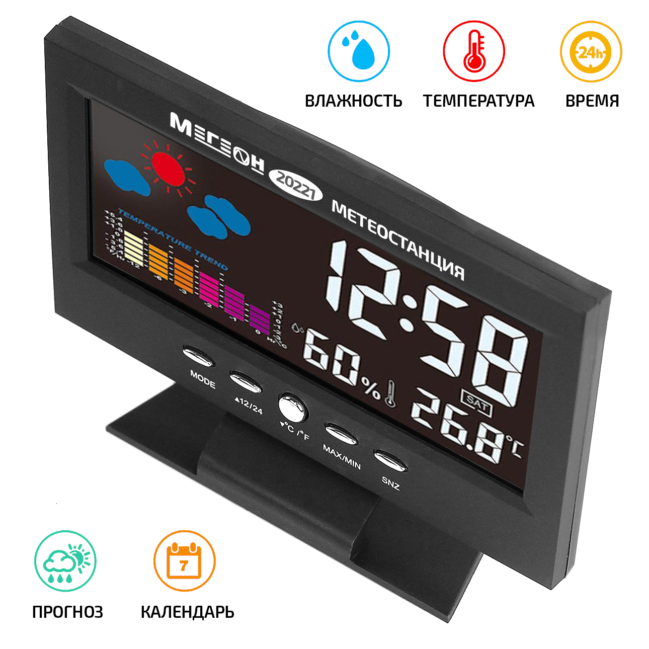 МЕГЕОН 20221 — новинка в модельном ряду термогигрометров для домашнего использования. Модель получила стильный внешний вид и яркий цветной ЖК-дисплей. Прибор одновременно показывает текущее время в 12 или 24 часовом формате, день недели, вычисляет минимальную и максимальную зафиксированные температуру и влажность. Одной из особенностей является наличие функции автоматической активации подсветки экрана при появлении постороннего звука. Метеостанция с успехом заменит будильник, а также предупредит о неблагоприятной обстановке в помещении. Применение современных комплектующих высокого качества позволило добиться низких показателей погрешности и увеличения скорости вычисления данных. Благодаря эргономичному дизайну и компактным размерам изделие идеально впишется в любой интерьер и займёт достойное место на тумбочке в спальне или на письменном столе.